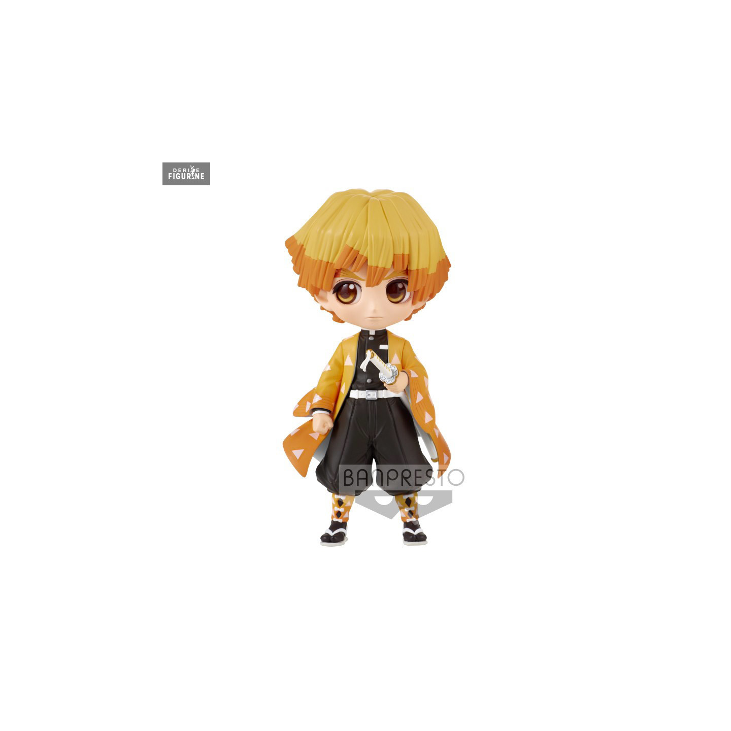 Figurine officielle de Zenitsu Agatsuma II, Classique en PVC mesurant environ 14 centimètres de haut. Elle est issue de la collection Q Posket. Le fabricant est Banpresto.