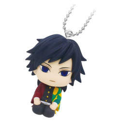 Visuellement, l’image montre six mini figurines au style chibi, toutes avec une boucle et une chaîne boule argentée au-dessus de la tête. Giyu Tomioka apparaît avec des cheveux bleu nuit et une tenue sombre, Tanjiro Kamado avec ses cheveux bordeaux et sa tenue de pourfendeur, et Nezuko Kamado avec de longs cheveux noirs, des yeux rosés et un ruban rose sur le côté. En bas, Tengen Uzui porte un large bandeau clair orné et des marques rouges au visage, Inosuke Hashibira est représenté avec son masque de sanglier au museau rose et aux yeux bleus, et Zenitsu Agatsuma affiche ses cheveux jaunes en “dégradé” avec une expression souriante. Grâce au format dangler, tu peux les accrocher facilement à un trousseau, une fermeture éclair ou une anse de sac.