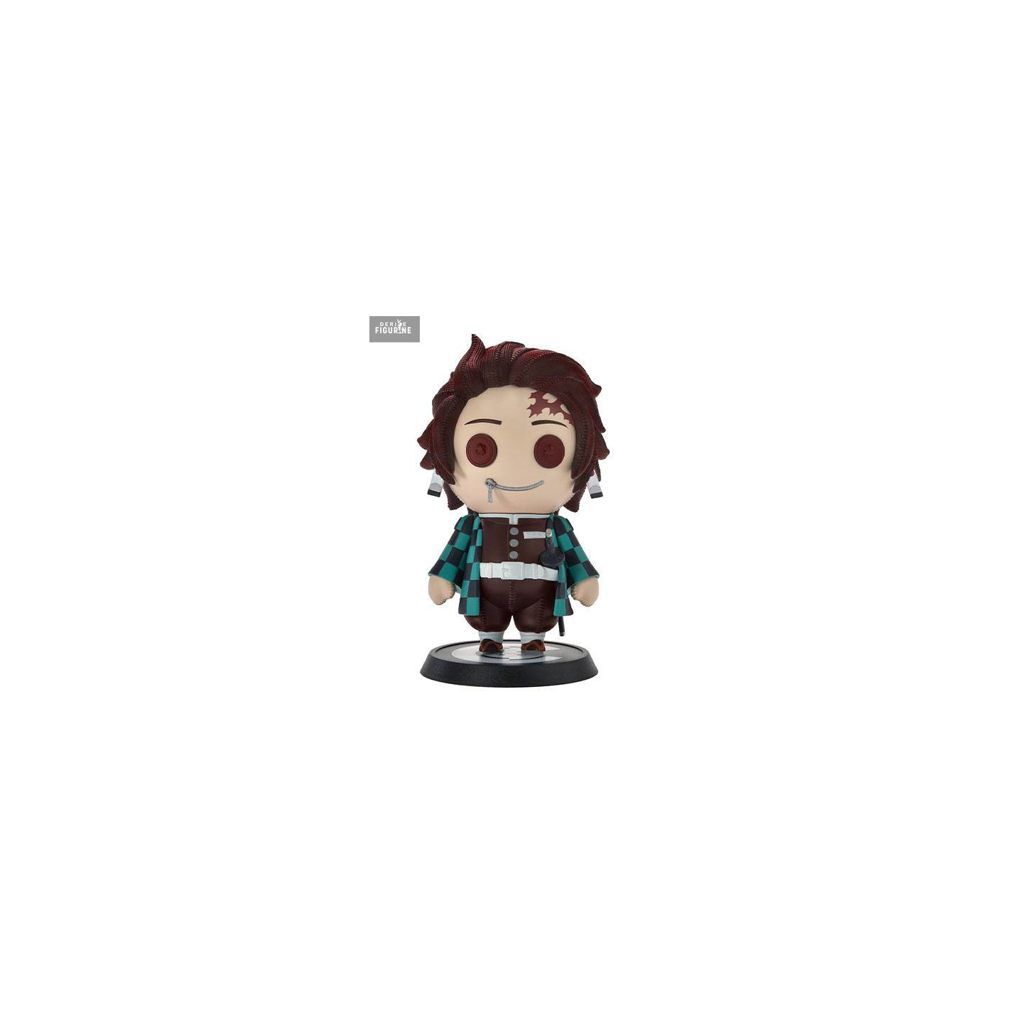 Avec ses yeux-boutons, sa cicatrice sur le front, son haori à carreaux vert et noir fidèlement représenté, Tanjiro conserve tout ce qui fait son identité visuelle — mais sous une forme ultra mignonne. Même son sabre miniature, accroché à sa taille, est là ! La fermeture éclair sur la bouche est une touche signature de la gamme, qui renforce le look “jouet cousu main”.