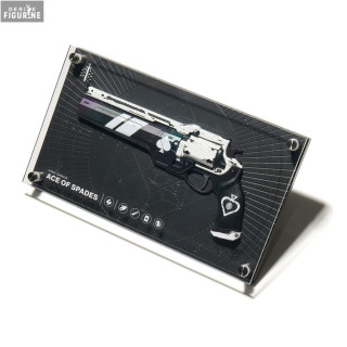 L’arme est reproduite en relief sur une plaque acrylique noire sérigraphiée, avec ses détails techniques et son esthétique brute futuriste. Le fond géométrique, les icônes stylisées, et l’effet 3D de la pièce centrale offrent un rendu ultra premium, qui rend hommage à la légende de Cayde et à son revolver culte.