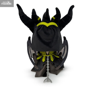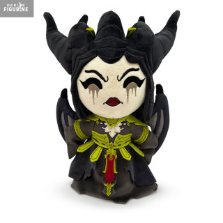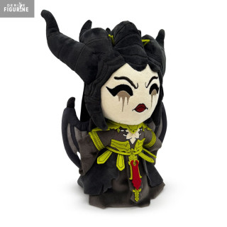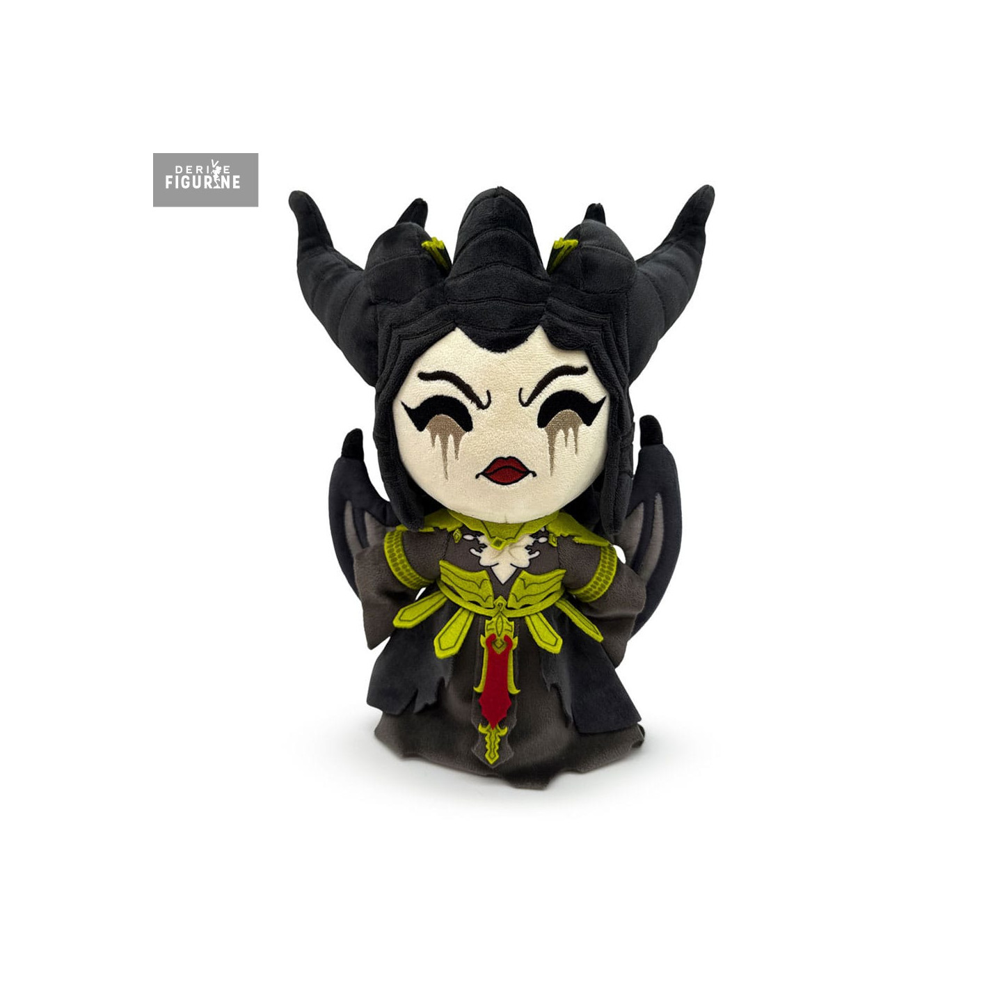 Cornes sculptées, robe sombre détaillée avec ses broderies vertes et rouges, maquillage noir dramatique autour des yeux, tout est là pour capturer son aura imposante. Malgré son format 22 cm, cette peluche ne passe pas inaperçue : elle impose le respect… même depuis ton étagère.