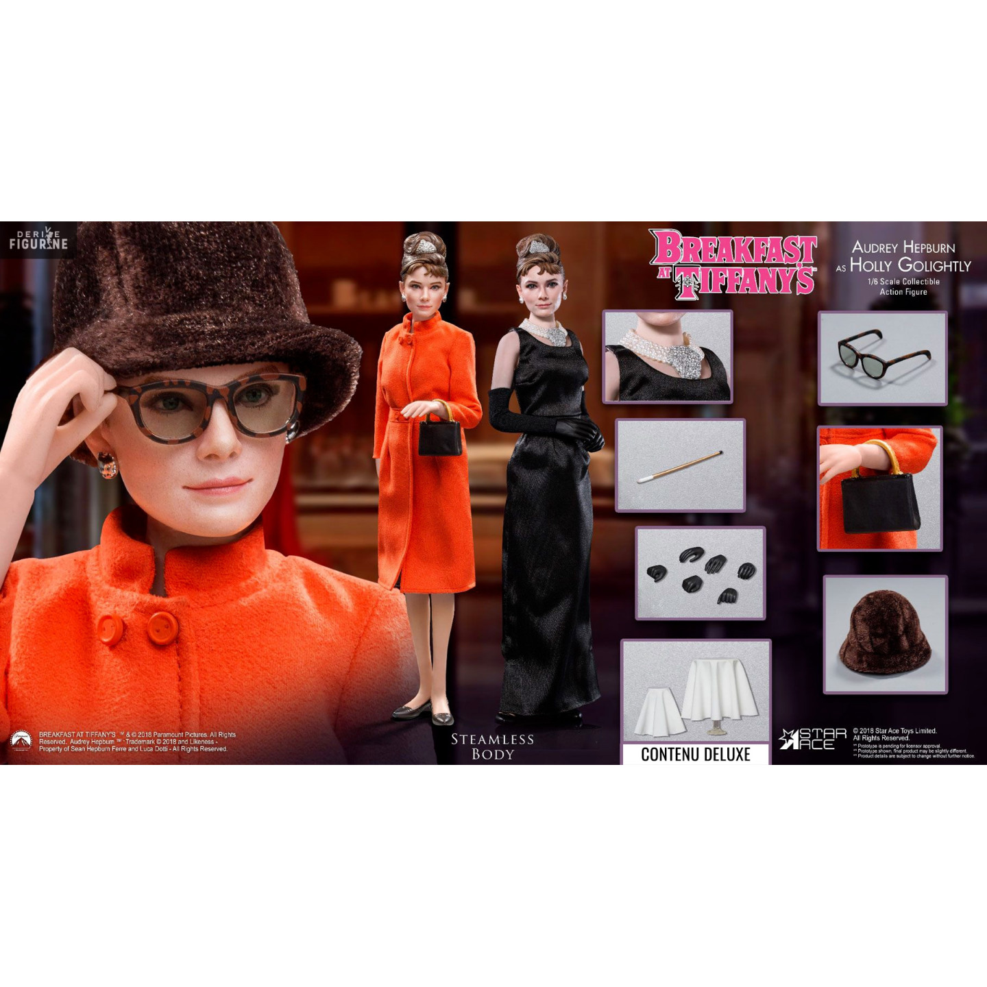 Diamants sur canapé est un film mettant en scène l'irrésistible actrice Audrey Hepburn dans le rôle de la belle et ravissante Holly Golightly. Cette nouvelle version de cette figurine déjà sortie propose en plus Holly dans sa tenue pour sortir de couleur orange. La version classique vous propose la figurine avec les deux styles vestimentaires mais sans la table et la chaise. Quant à la deluxe, elle propose bien évidemment en bonus, la fameuse table et la chaise afin de pouvoir mettre une scène d'exposition en place très facilement.