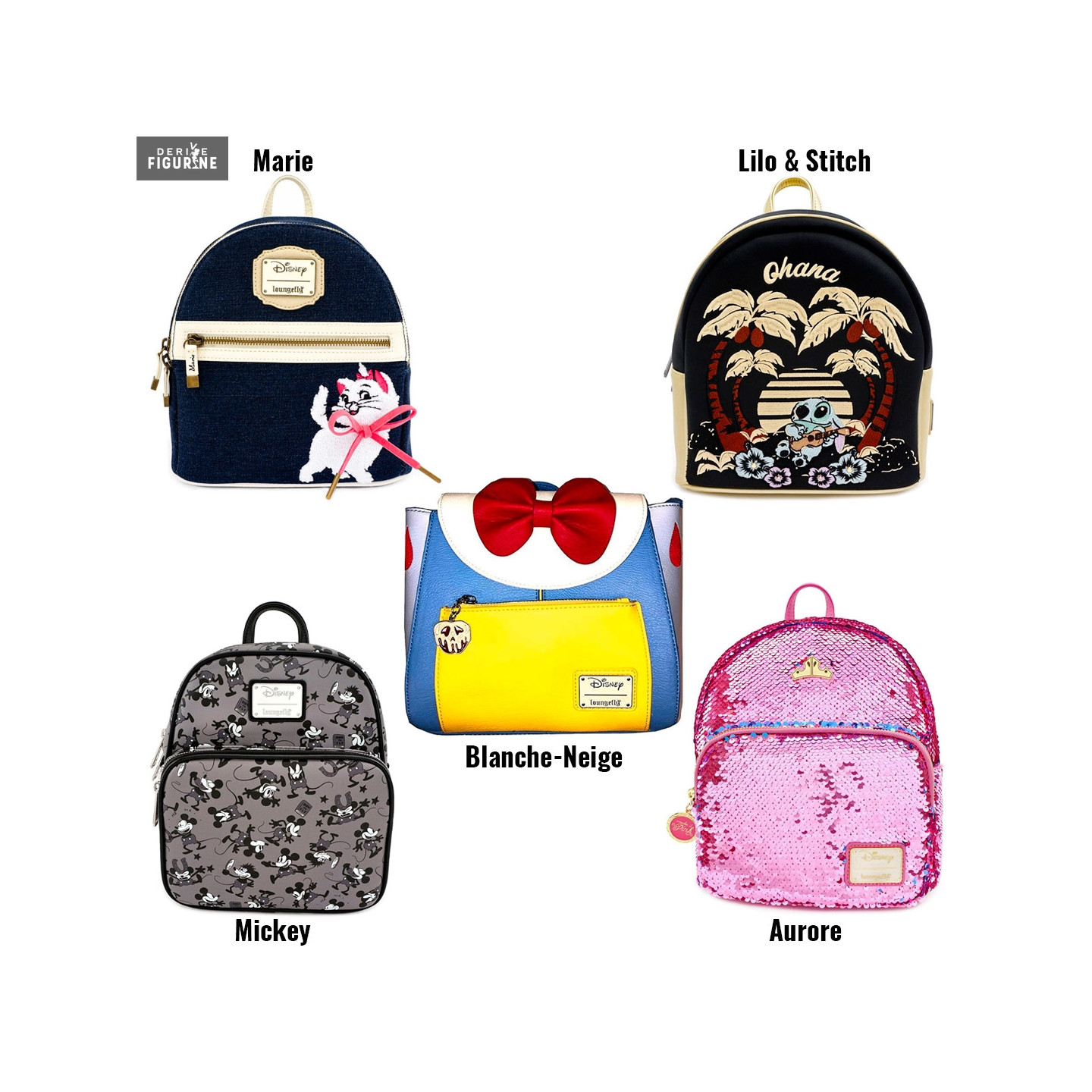 Sac à dos de Disney au choix entre les versions Lilo & Stitch, Mickey, Marie, Blanche-Neige ou Aurore (voir détails en description). Le fabricant est Loungefly.