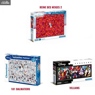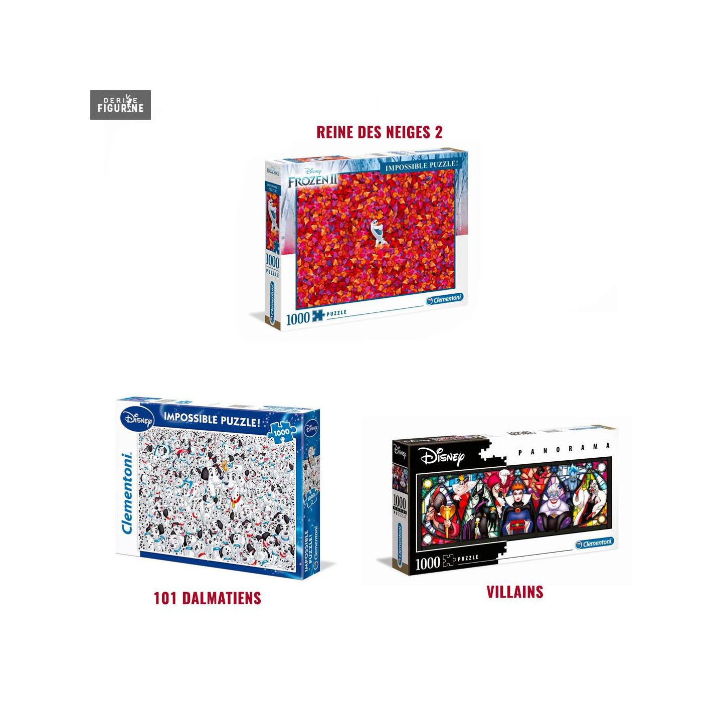 Puzzle officiel au choix entre la version Reine des Neiges 2, 101 Dalmatiens ou Villains de 1 000 pièces. Le fabricant est Clementoni.