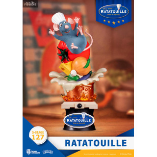 Comme le disait si bien Gusteau, tout le monde peut cuisiner. C'est ce que Rémy s'est dit depuis des années, car même s'il est un rat, il adore la bonne nourriture mais il n'aurait pas pensé devenir cuisinier dans un restaurant et c'est pourtant ce qu'il a fait grâce à Alfredo Linguini. Vous pouvez ici admirer notre petit chef sur les fourneaux, en train de préparer un bon petit plat avec une tomate, un oignon, du fromage et tout un tas d'autres ingrédients. En plus de cela, la figurine de Rémy est flockée, ce qui donne l'impression qu'il a de petits poils.