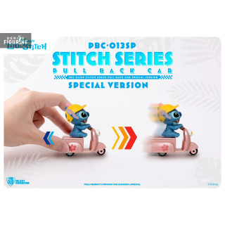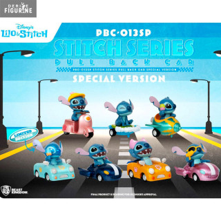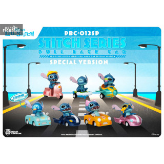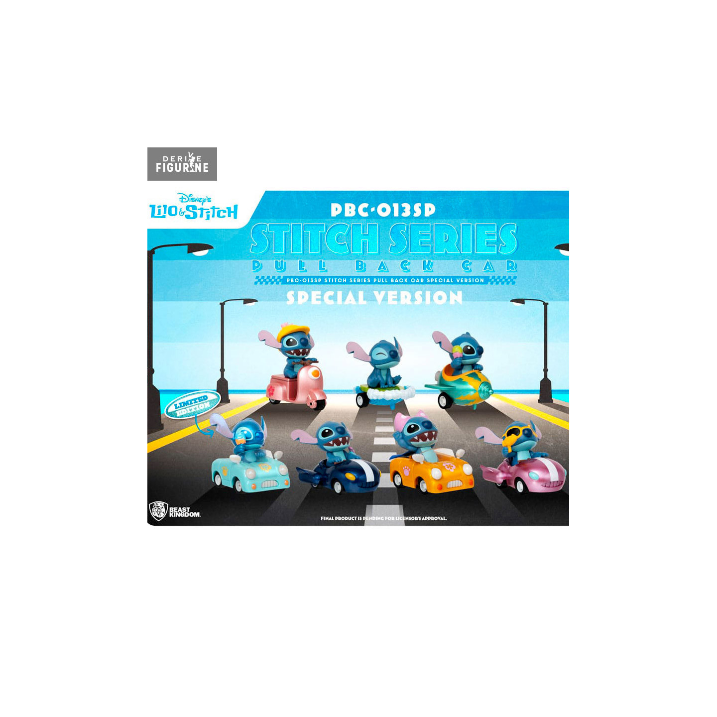 Figurines officielles de Stitch en PVC mesurant environ 4 à 6 centimètres de haut. Elles sont issues de la collection Pull Back Car. Le fabricant est Beast Kingdom.