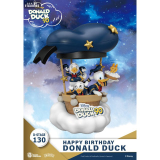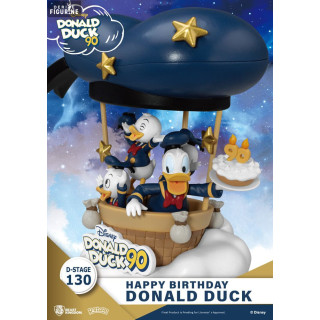 Figurine officielle de Donald Duck 90th, Happy Birthday en PVC mesurant environ 14 centimètres de haut. Elle est issue de la collection D-Stage. Le fabricant est Beast Kingdom.