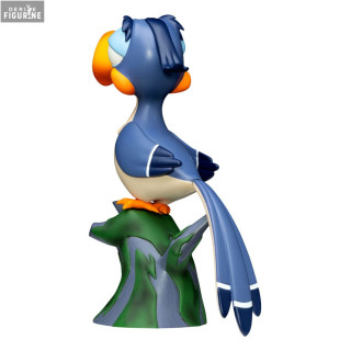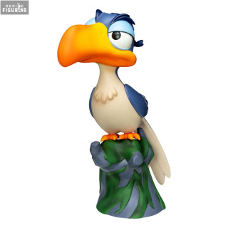 À côté de lui se tient Zazu, le majordome royal loyal et souvent comique. Avec son plumage éclatant et son bec distinctif, Zazu est capturé avec une précision remarquable, affichant une expression légèrement exaspérée mais affectueuse. La figurine de Zazu repose sur une base assortie, ce qui lui donne une présence dynamique aux côtés de Simba.