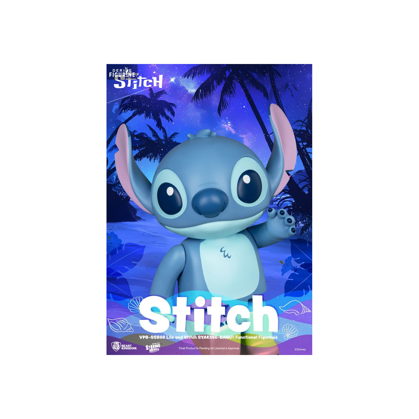 Tirelire figurine officielle de Stitch en vinyle mesurant environ 30 centimètres de haut. Elle est issue de la collection Syaking Bang. Le fabricant est Beast Kingdom.