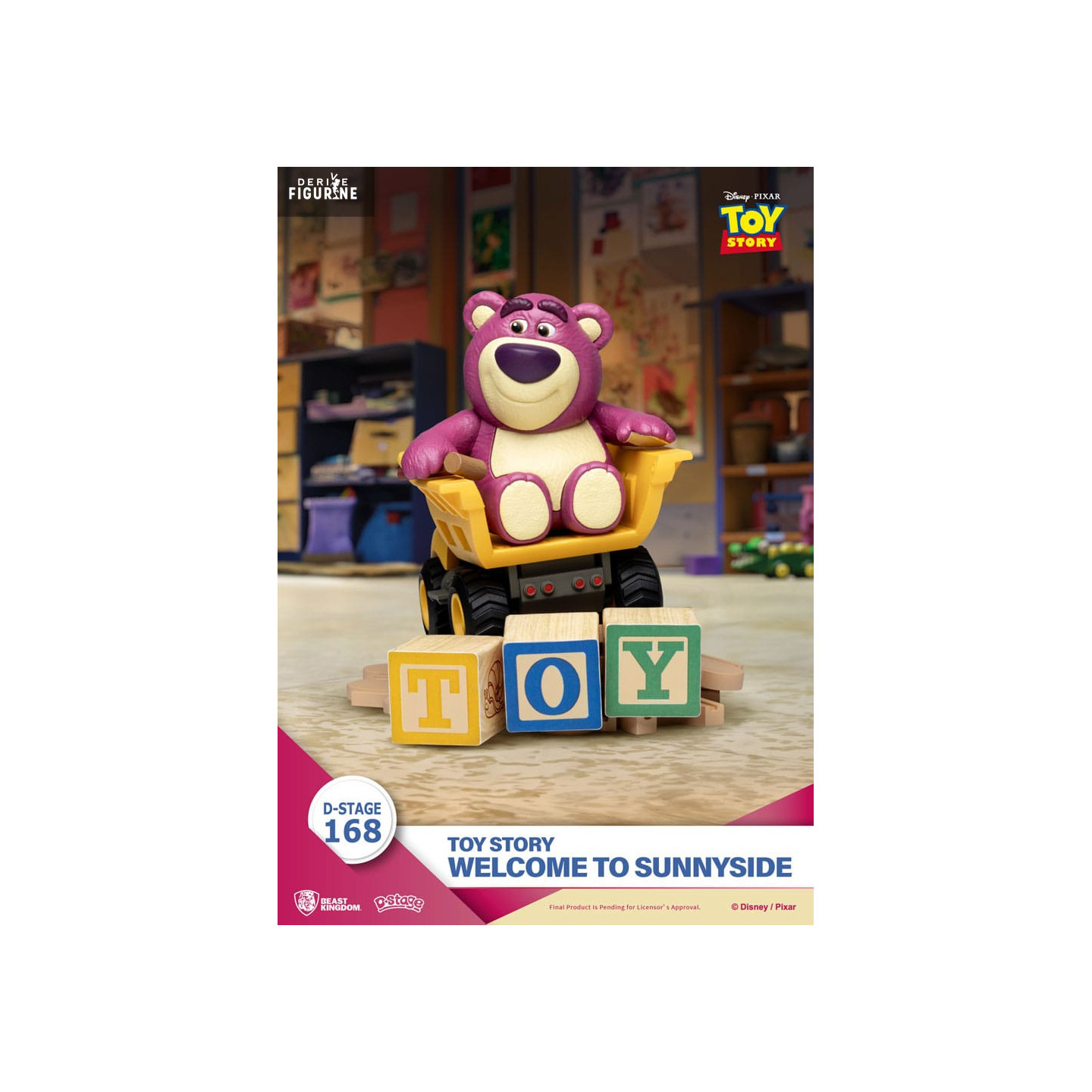 La figurine, issue de la collection D-Stage par Beast Kingdom, est en PVC et mesure environ 14 cm de haut. Elle met en scène Lotso assis sur un camion de chantier, avec les cubes "T", "O" et "Y" soigneusement placés devant lui. Les détails sont superbes, la finition impeccable, et l’ensemble respire l’esprit Pixar, avec ce subtil mélange d’humour et de sous-texte.