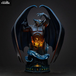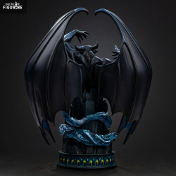 Le socle sculpté dans un style gothique et ornementé de vitraux stylisés renforce l’esthétique sombre et mystique de la pièce. Une nuée de brume bleutée serpente autour de la base, contrastant avec les tons chauds et ténébreux du démon.