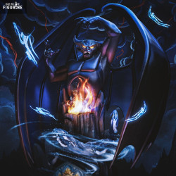 Chernabog est représenté ailes déployées, trônant sur une montagne maudite, les bras levés dans une gestuelle inquiétante. Son corps massif, aux muscles ciselés, émerge de l’obscurité, tandis que son visage expressif — aux yeux brillants et aux cornes recourbées — capte toute la terreur qu’il inspire. Au creux de la base, on aperçoit des flammes et des créatures tourmentées, dans une mise en scène directement inspirée du film.