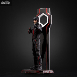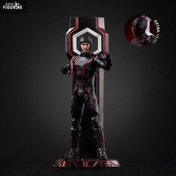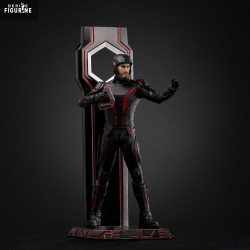 Il est ici représenté en tenue de combat noire soulignée de lignes rouges lumineuses, fidèle à l’esthétique néon emblématique de la franchise. Le design est épuré, presque militaire, et renforcé par une base stylisée et un arrière-plan aux formes géométriques rappelant les portails de transfert du Grid.