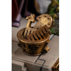La pièce montre Kuzco légèrement penché, vêtu de son poncho rouge et de sa coiffe dorée en éventail, jambes fines et sandales dorées, le regard en coin qui traduit bien son côté sûr de lui. Juste derrière, Yzma se dresse dans une longue robe noire moulante, épaules soulignées par un large col plumé violet, peau pâle et visage anguleux, coiffée d’un chapeau violet immense qui s’élève très haut au-dessus d’elle. À leurs pieds, la base reprend des formes de blocs de pierre sculptés avec des motifs dorés, de petites structures façon palais et tours, et même de minuscules personnages stylisés, comme un petit diablotin rouge près de Kuzco et une petite silhouette claire perchée sur une tour. L’ensemble forme un décor riche en détails qui rappelle les décors du film et qui attire tout de suite l’œil dans une collection Disney.
