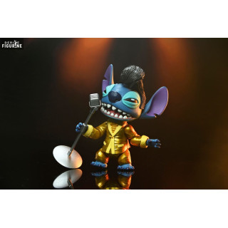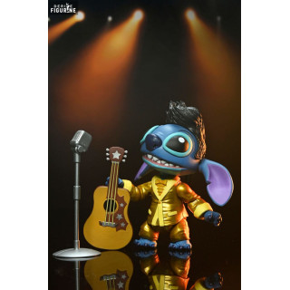Figurine officielle de Stitch, Gold Suit Elvis mesurant environ 18 centimètres de haut. Elle est issue de la collection Ultimate. Le fabricant est NECA.
