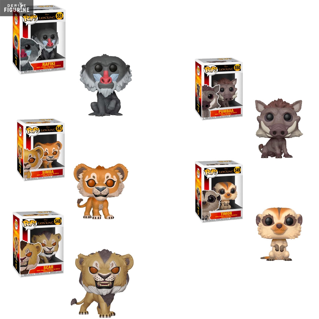 Figurine officielle au choix entre Simba, Timon, Pumbaa, Rafiki ou Scar en vinyle, mesurant environ 9 centimètres. Le fabricant est Funko.