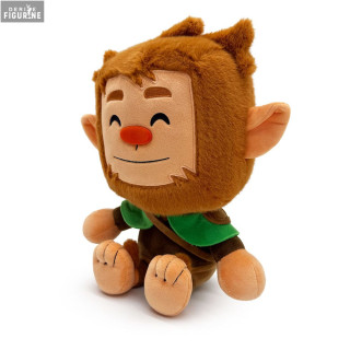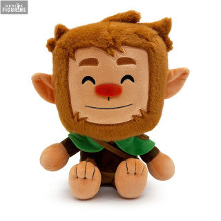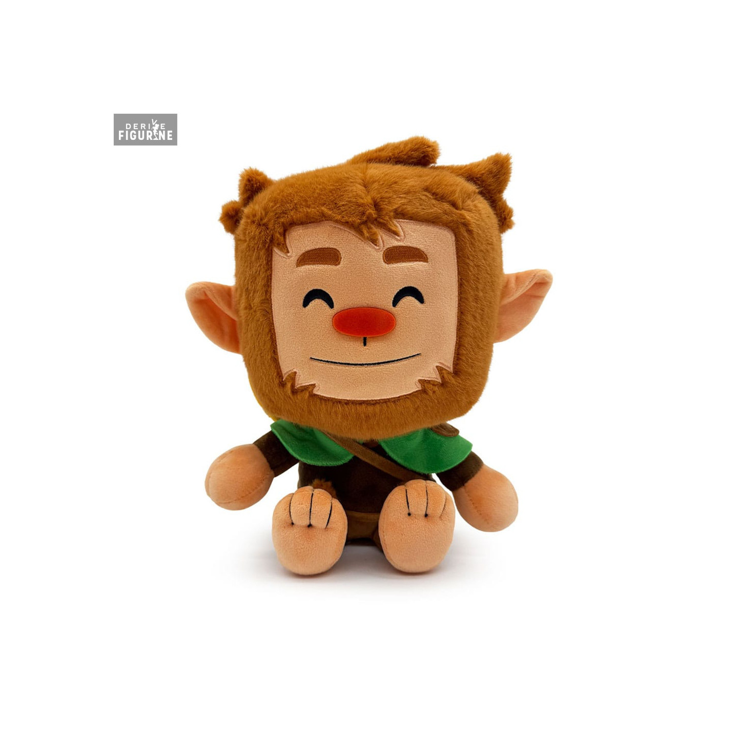 La peluche le représente assis, avec de grandes oreilles pointues et un visage encadré par une barbe et des cheveux bruns doux au toucher. Son nez rouge, placé au centre d’un grand sourire, traduit parfaitement son caractère enjoué. Il porte une tenue marron ornée d’une petite cape verte et d’une sangle en bandoulière. Les détails brodés sur ses mains et ses pieds apportent du relief et du charme à l’ensemble.