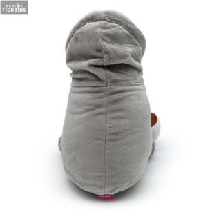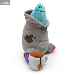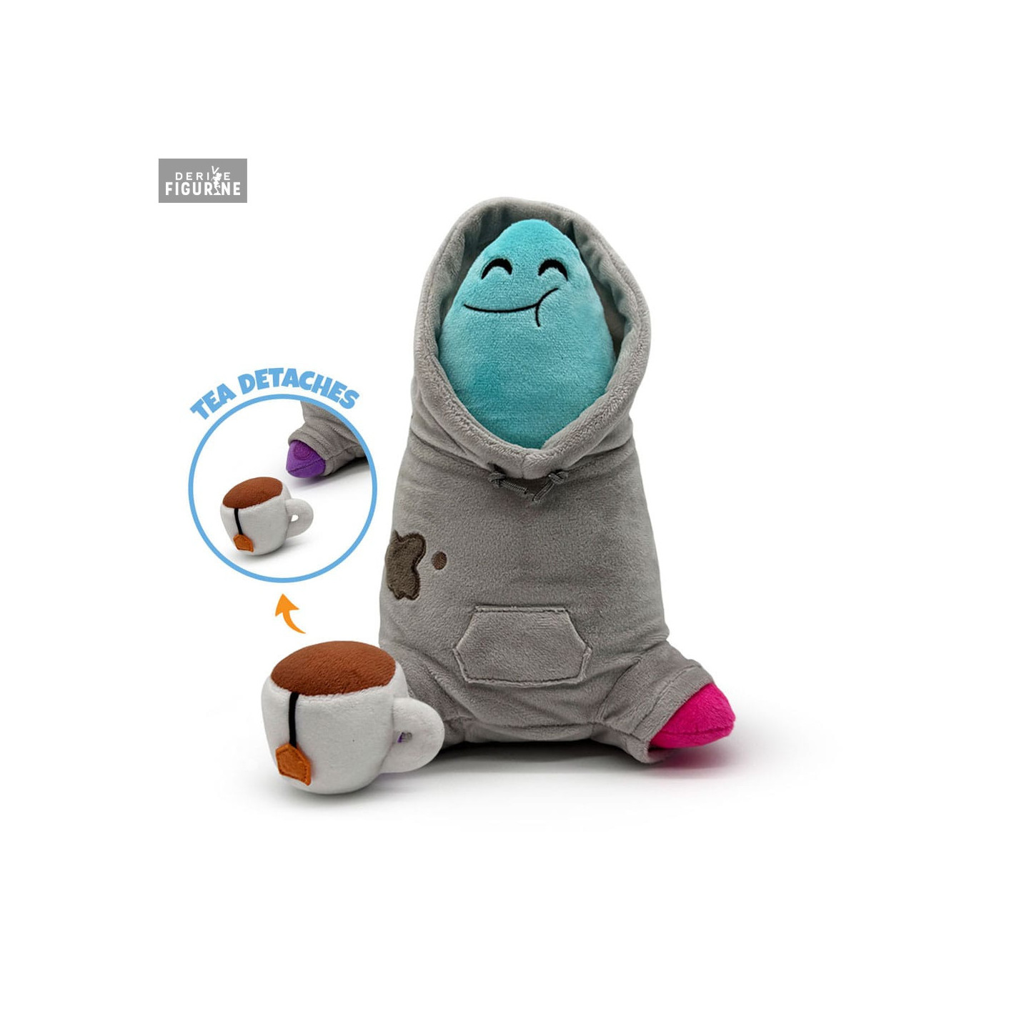 La peluche le représente fidèle à son apparence : un corps bleu vif coiffé d’un sweat à capuche gris avec poche ventrale et petite tache brune sur le côté, laissant apparaître un pied violet et un pied rose. Son visage arbore un grand sourire détendu et des yeux fermés, signe de sa bonne humeur. Un accessoire amovible en forme de tasse de thé vient compléter le tout, se détachant facilement pour varier la présentation.