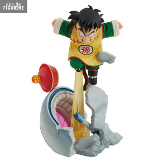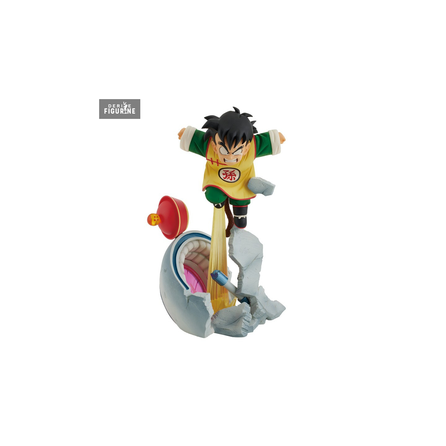 Gohan est représenté dans une pose dynamique, suspendu dans les airs avec une énergie palpitante. Son expression faciale dévoile sa détermination à protéger ses proches et à relever tous les défis qui se dressent sur son chemin. La figurine est minutieusement détaillée, mettant en avant les caractéristiques distinctives de la tenue traditionnelle de Gohan, y compris son chapeau rouge qui semble flotter dans l'air, créant une scène visuellement saisissante.