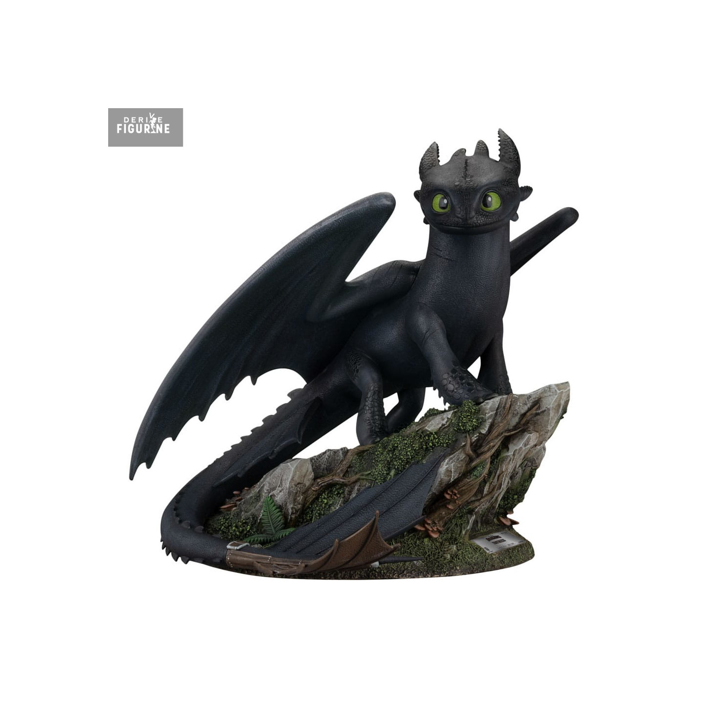 Le socle, sculpté comme un rocher moussu, met en valeur chaque muscle et écaille de Krokmou, tandis que sa peinture sombre se pare de reflets subtils qui captent la lumière. Les yeux d’un vert perçant lui confèrent une présence magnétique, et le soin apporté aux détails — crocs, griffes, membrane des ailes — restitue fidèlement l’allure à la fois féroce et élégante du Night Fury.