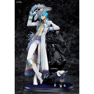 Aoba Seragaki est le personnage principal de DRAMAtical Murder. Il adore la viande et le ragoût de pommes de terre. On le voit ici accoudé à une pièce d'échec géante du cavalier, et à ses pieds vous pouvez voir un chat avec un chapeau.