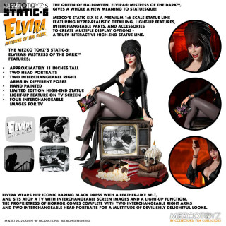 Elvira maîtresse des ténèbres est une série télévisée mettant en scène la belle et irrésistible Elvira et la voici se présentant à vous dans sa figurine de la gamme des Static-6. La figurine la montre assise sur un téléviseur qui possède une fonction LED avec quatre visuels interchangeables. Elvira fait donc une magnifique entrée dans cette réalisation qui fait honneur à la star qu'elle est dans la série horrifique Z.
