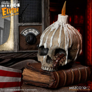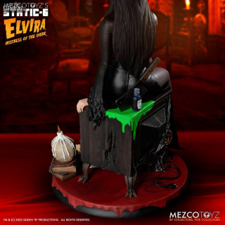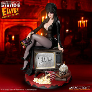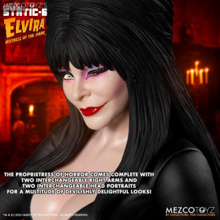 Figurine officielle de Elvira en PVC mesurant environ 28 x 18 centimètres, à l'échelle 1/6. Il vient de la collection Static-6. Le fabricant est Mezco Toys.