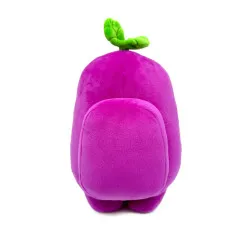 Visuellement, la peluche est violette, bien dodue, avec les deux bras levés sur les côtés comme si elle faisait coucou. À l’avant, on voit une grande visière bleu clair bordée de noir, avec des lignes façon fissures dessinées dessus, et deux petits yeux simples au centre. Juste en dessous, une énorme bouche noire est remplie de grandes dents blanches triangulaires, et un petit sprout vert (deux feuilles) sort du haut de la tête.