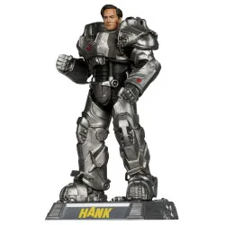 Visuellement, on le voit debout en armure assistée massive, dans des tons gris métallisé avec un sous-combinaison noire visible entre les plaques. Les épaules sont très larges, le torse est couvert de panneaux anguleux et de détails mécaniques, et on repère quelques marquages rouges sur l’armure. La pose est simple mais efficace : poings serrés, jambes bien ancrées, grosses bottes blindées. Il est présenté sur un socle noir avec son nom “HANK” écrit en jaune à l’avant.