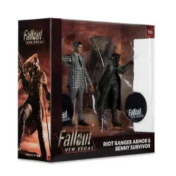 Visuellement, Benny porte une veste à motif carreaux noir et blanc, une chemise claire avec cravate, un pantalon gris et des chaussures sombres, le tout avec une pose simple et droite. Le Ranger est entièrement dans des tons gris/noir, avec un casque à visière rouge, un long manteau sombre et des pièces d’armure superposées sur le torse et les jambes. Sur l’image, on voit aussi deux visuels/cartes au format poster et un disque noir marqué Fallout: New Vegas, qui renforcent l’effet “pack d’expo” une fois posé sur une étagère.