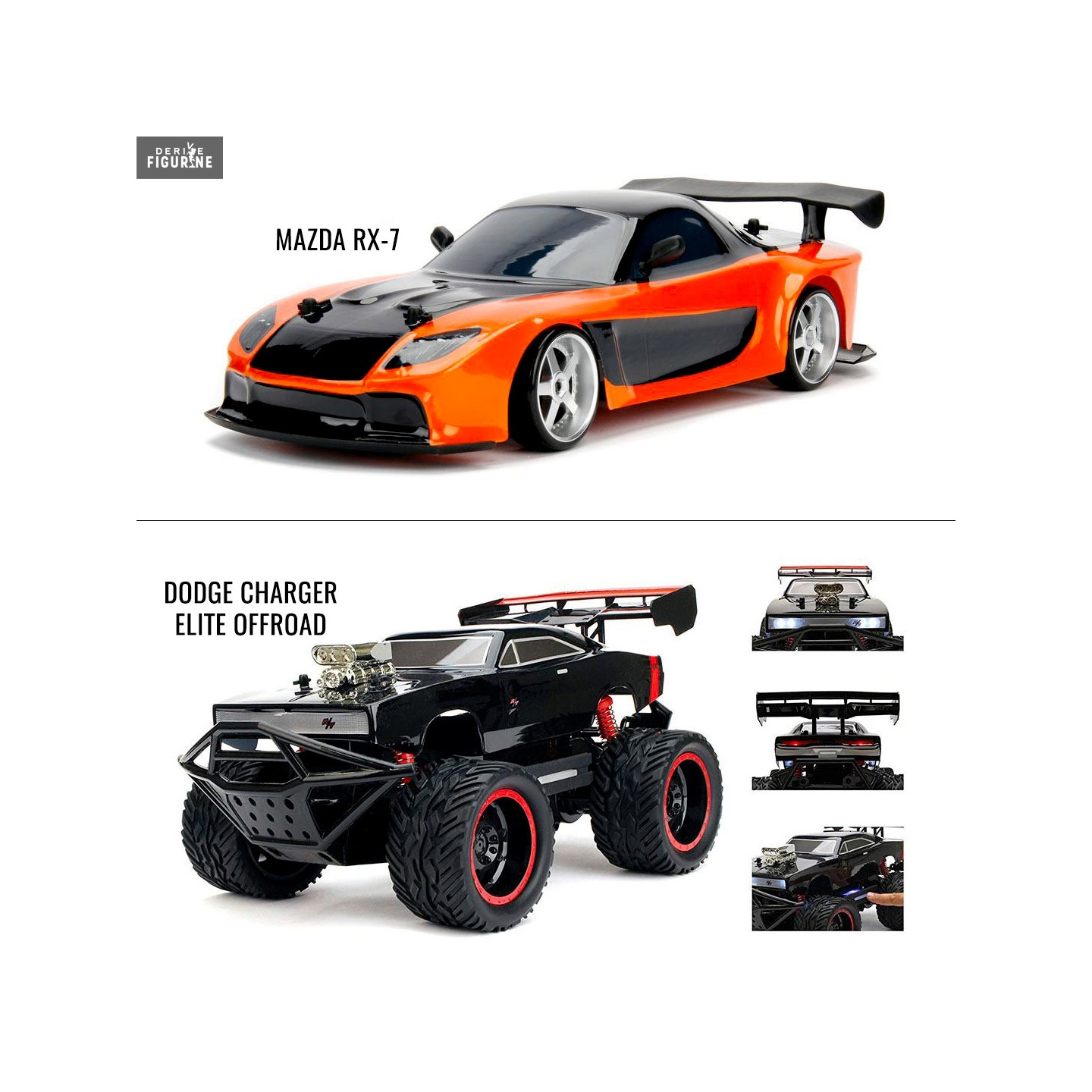 Voiture radiocommandée officielle au choix entre la Mazda RX-7 ou le Dodge Charger Elite Offroad (voir détails en description). Le fabricant est Jada Toys.