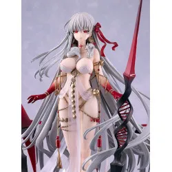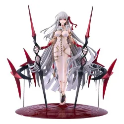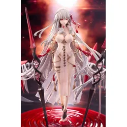 Visuellement, elle se tient debout, très centrée, avec une longue chevelure argentée/blanche qui descend en larges mèches et quelques rubans rouges visibles. Sa tenue est très minimale dans des tons ivoire avec des détails dorés, et de fins éléments décoratifs suivent le buste et les hanches. Autour d’elle, un imposant ensemble d’armes et de structures noires s’ouvre comme un halo mécanique, avec des pointes/lames rouges très marquées, et des pièces en spirale qui rappellent des torsades. Le tout repose sur une grande base rouge translucide, large et plate, qui donne une vraie présence en vitrine.