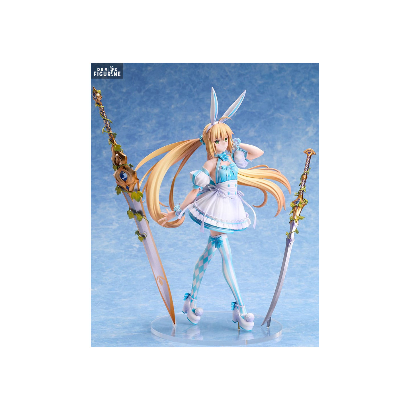 La figurine présente Altria Caster dans une tenue élaborée de style maid avec des accents bleus et blancs, soulignant son côté innocent et pur tout en conservant une élégance royale. Les longues oreilles de lapin ajoutent une touche de fantaisie et de charme, renforçant son apparence adorable. Sa pose gracieuse et dynamique, avec un sourire espiègle sur les lèvres, capture parfaitement son caractère unique.