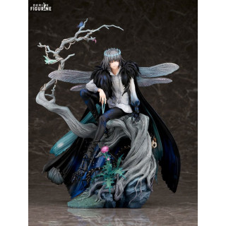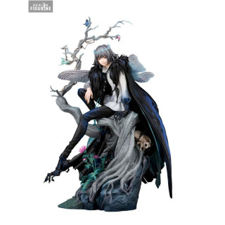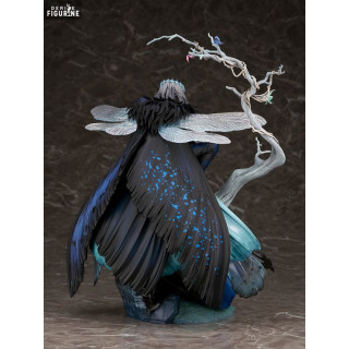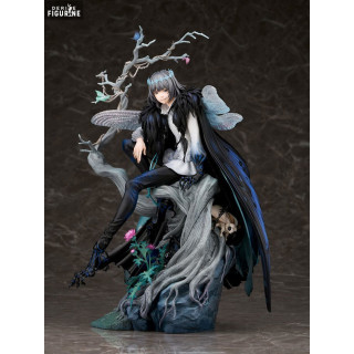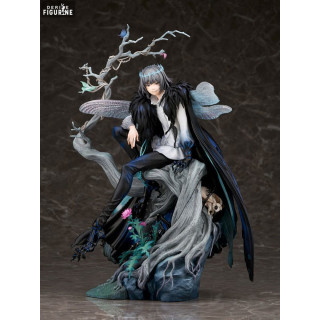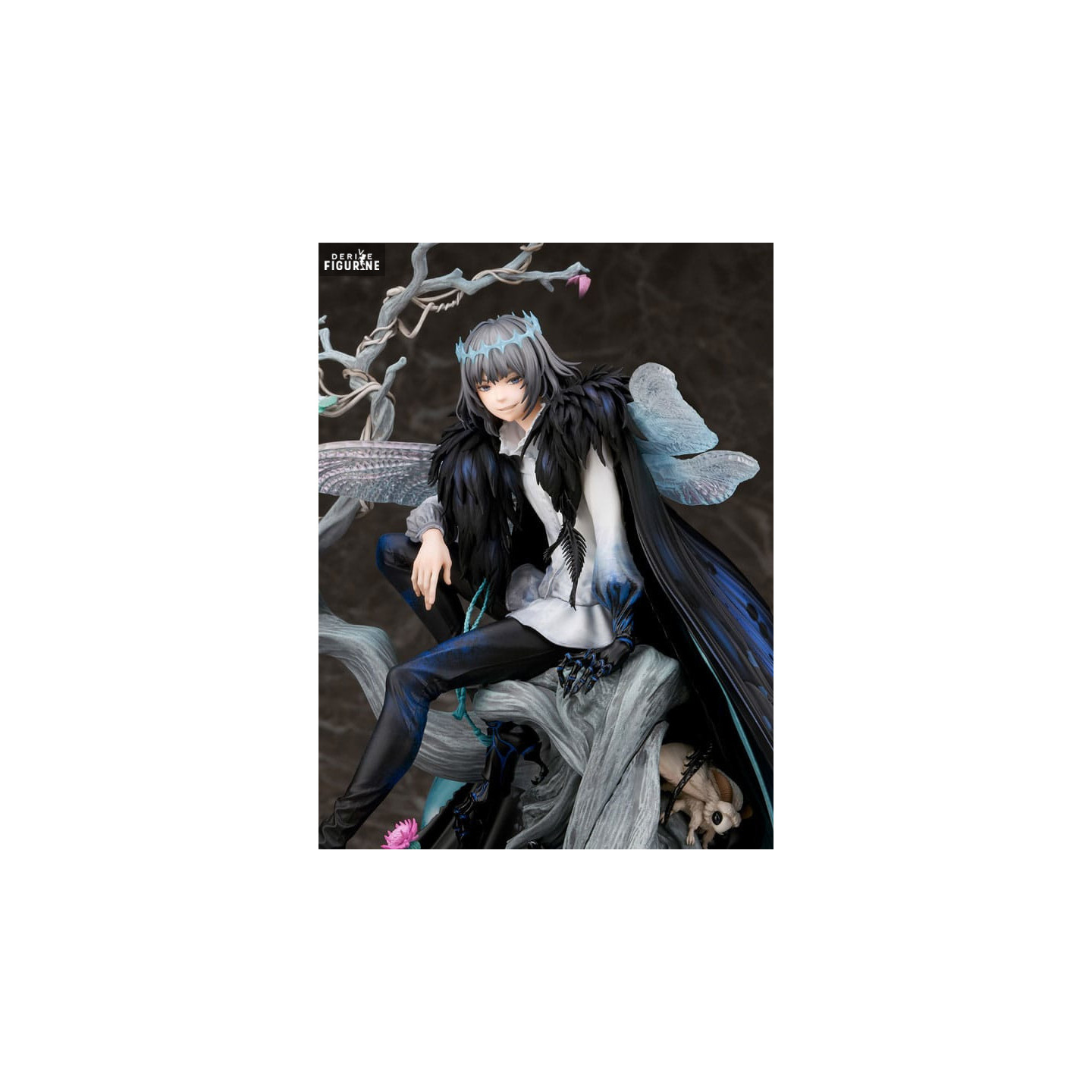 La figurine de Pretender / Oberon Vortigern capture l'élégance et la sophistication du personnage avec une attention méticuleuse aux détails. Oberon est représenté assis de manière nonchalante sur une branche d'arbre sinistrement détaillée, entouré d'éléments naturels et mystiques comme des papillons et des crânes. Sa tenue, composée de vêtements noirs et blancs avec des accents bleus, est magnifiquement sculptée, mettant en valeur les textures et les plis du tissu.