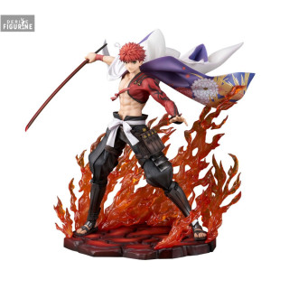 L’ensemble repose sur une base rouge texturée entourée de flammes sculptées dans un PVC translucide. Ces flammes apportent une verticalité spectaculaire à la scène, en plus d’un effet dynamique très réussi. Les textures du tissu, des protections de jambes, et des motifs sur le kimono ont été soignées avec précision, offrant un équilibre parfait entre mouvement et détails.