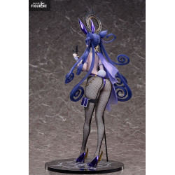 La figurine présente une tenue violette brillante, des bas résille finement sculptés et un justaucorps ajusté qui souligne sa silhouette. Sa longue chevelure indigo forme des arabesques dynamiques autour d’elle. Les oreilles de lapin rouges, le haut sceptre orné d’un cercle mystique, les escarpins assortis et le socle gravé renforcent l’esthétique à la fois magique et sensuelle de l’ensemble.