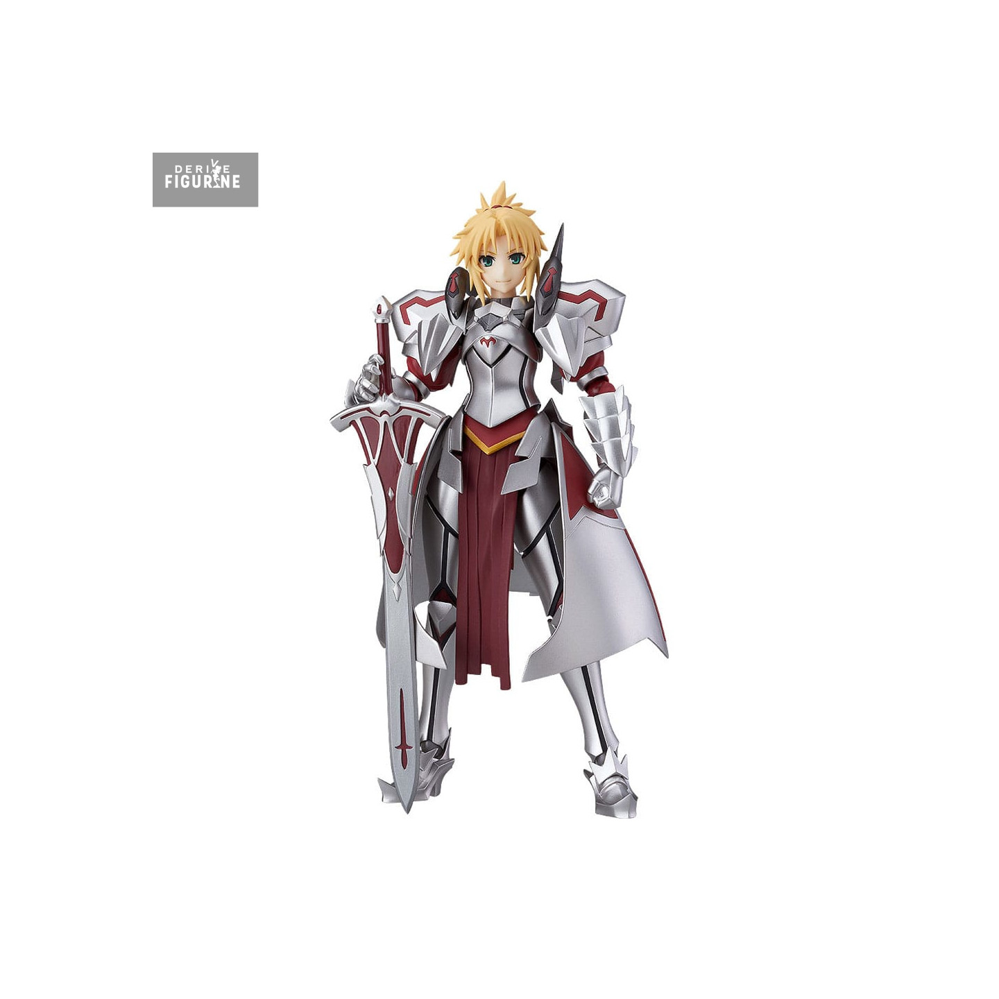 La figurine Figma reproduit fidèlement son apparence : armure argentée aux détails rouges, plaques épaisses, sabatons sculptés et tabard fendu. L’épée Clarent, stylisée avec des motifs en croix, est incluse. Les cheveux blonds hérissés et les expressions alternatives (calme, cri, déterminée) complètent le tout avec cohérence et impact.