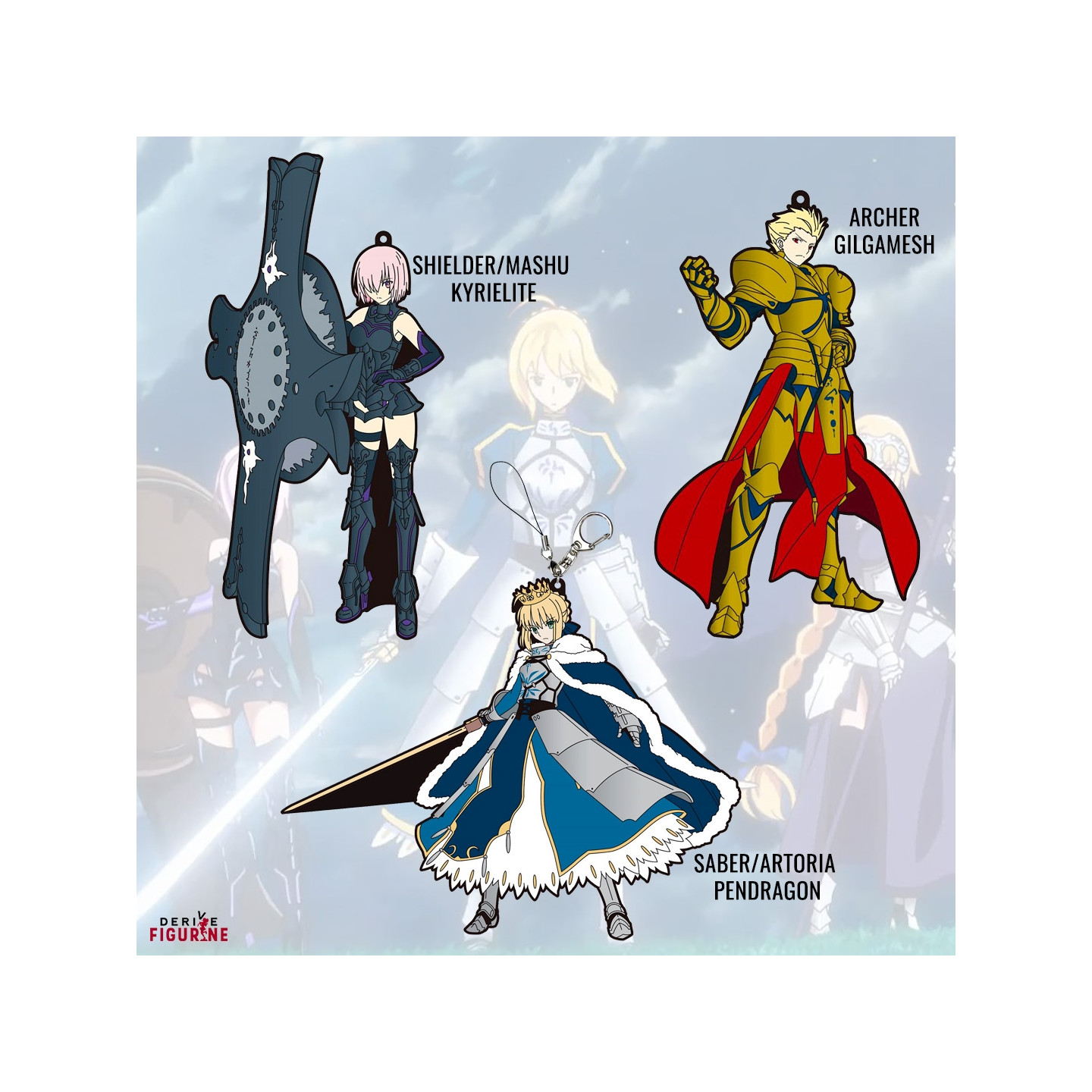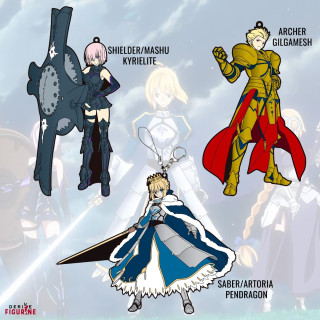 Porte-clés au choix entre Saber/Artoria Pendragon, Archer/Gilgamesh ou Shielder/Mashu Kyrielite en caoutchouc qui mesure environ 15 centimètres de haut. Le fabricant est FREEing.