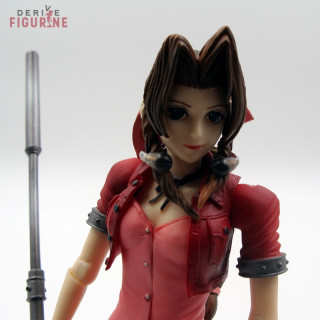 Figurine d'occasion et officielle d'Aeris Gainsborough en ABS/PVC d'environ 19,5 centimètres de haut. Elle est articulée et possède tous ses accessoires, à savoir deux mains de rechange, son arme et le socle. Il s'agit d'un objet d'occasion en parfait état de la collection Play Arts. Le fabricant est Square Enix, vendu avec boîte en bon état mais un peu décollée à l'arrière.