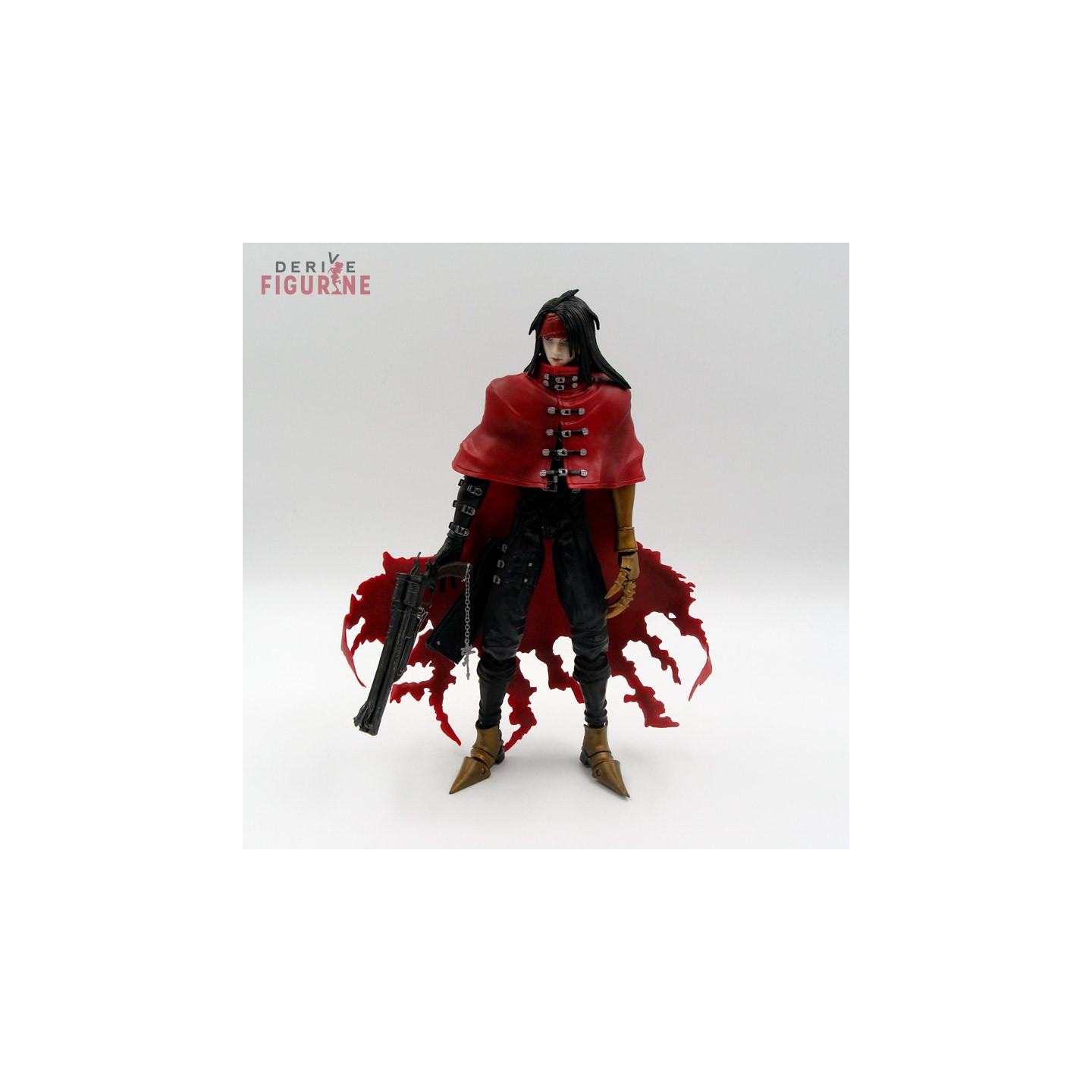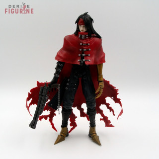 Figurine d'occasion et officielle de Vincent Valentine en PVC d'environ 22 centimètres de haut. Elle est articulée et a tous ses accessoires : une main de rechange, l'arme et le socle. Il s'agit d'un objet d'occasion en parfait état de la collection Play Arts, mais l'arme a un petit bout cassé mis dans la boîte pour éventuelle réparation. Le fabricant est Square Enix, vendu avec boîte en bon état.