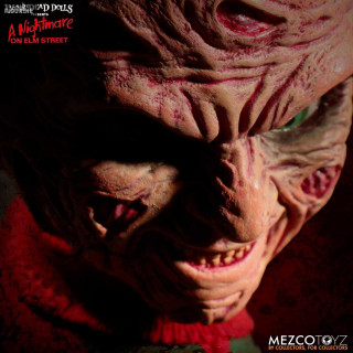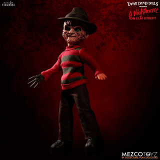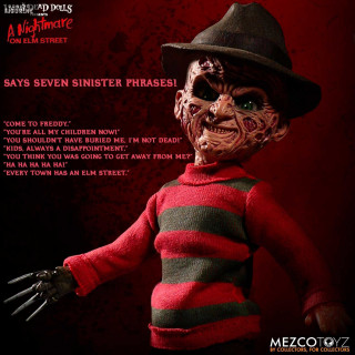 Poupée sonore officielle de Freddy Krueger mesurant environ 25 centimètres de haut. Elle est issue de la collection Living Dead Dolls. Le fabricant est Mezco Toys.