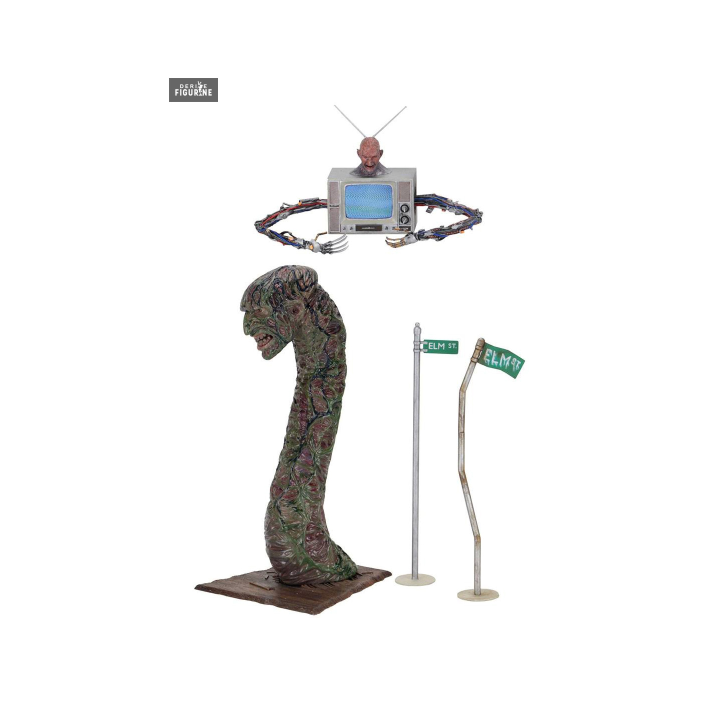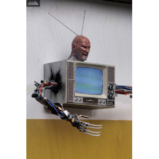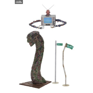 Ce pack contient 4 accessoires à utiliser pour vos scènes avec vos figurines NECA à l'effigie du tueur en série Freddy Krueger. Il y a donc la télévision, les deux panneaux et l'horrible créature avec la tête de Freddy !
