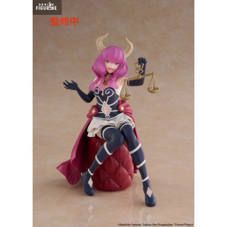 Aura est représentée assise avec grâce sur un coussin capitonné, tenant d’une main sa célèbre balance dorée — symbole de son pouvoir de domination absolue. Sa tenue, fidèle au design de l’anime, mêle noir et blanc avec des motifs en spirale sur le buste, une cape rouge vif drapée derrière elle, et des gants ainsi que des bas montant jusqu’aux cuisses.