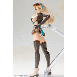 Sur la pièce, on retrouve une armure dominante beige composée de nombreuses plaques anguleuses sur les épaules, les bras, le torse, les cuisses et les jambes, reliées par des parties mécaniques gris foncé. Le centre du buste laisse apparaître un élément bleu clair qui attire le regard, rappelé par une visière assortie devant ses yeux, intégrée à un casque qui coiffe ses cheveux blonds. Les jambes sont massives, couvertes de panneaux articulés et de détails techniques, avec de grands pieds stables, tandis qu’un long fusil futuriste gris foncé est tenu à deux mains. L’ensemble donne une silhouette bien équilibrée, entre mecha lourd et personnage articulé, idéale à poser au cœur d’une sélection Front Mission.