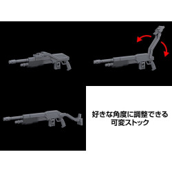 Visuellement, le mecha est majoritairement blanc/gris clair, avec de gros blocs gris foncé et bleu nuit sur les épaules, les bras, la taille et les jambes. La tête est compacte, avec un visage masqué et une petite antenne, et les épaules sont surmontées de pointes/ailerons sombres. Il tient un fusil long dans une main, et un gros ensemble d’équipement est fixé dans le dos, avec une pièce verticale qui dépasse au-dessus de l’épaule. Les jambes sont très épaisses, avec de grands panneaux d’armure et des pieds anguleux bicolores, ce qui donne une silhouette stable et bien “posée” en exposition.