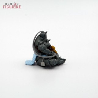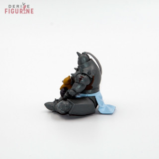 Figurine d'occasion et officielle d'Alphonse Elric en PVC qui mesure environ 5,5 centimètres de haut. Alphonse est assis en tailleur avec un petit chat dans les mains. Il fait une drôle de tête. Il s'agit d'un objet d'occasion en parfait état. Le fabricant est Bandai, vendu sans boîte.