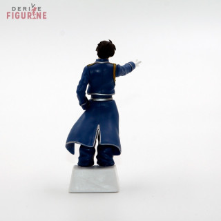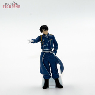 Figurine d'occasion et officielle de Roy Mustang en PVC qui mesure environ 10 centimètres de haut. L'alchimiste de flamme a la main tendue, prêt à défier le premier venu. Il s'agit d'un objet d'occasion en parfait état. Le fabricant est Bandai, vendu sans boîte.