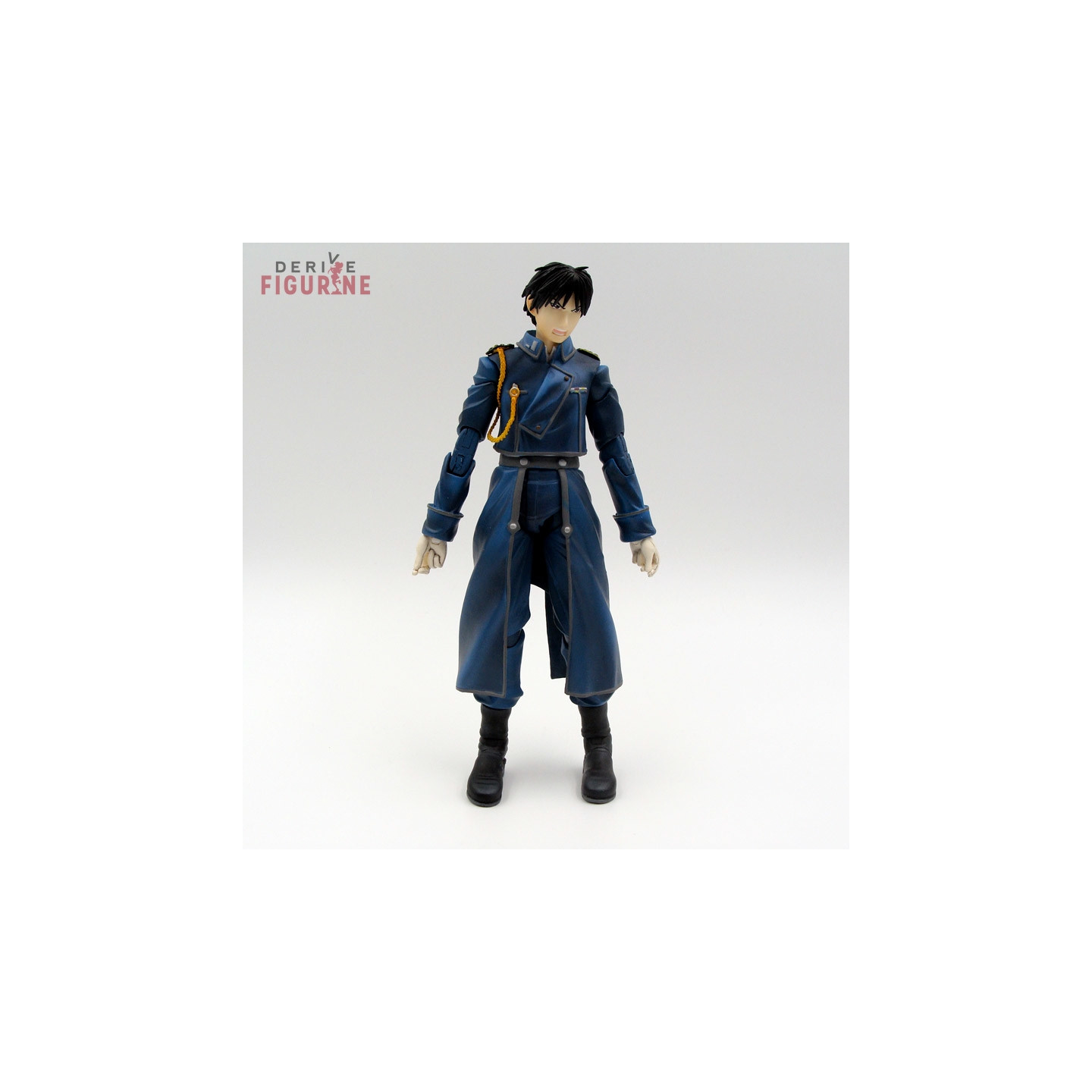 Figurine d'occasion et officielle de Roy Mustang en ABS/PVC d'environ 20 centimètres de haut. Elle est articulée avec tous ses accessoires. Il s'agit d'un objet d'occasion en bon état de la collection Play Arts Kai, mais l'arrière de sa cape est déchirée en deux. Le fabricant est Square Enix, vendu avec boîte en assez bon état.