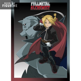 Edward Elric est au premier rang de ce poster. Il porte sa tenue d'alchimiste et sa cape rouge au dessus de son épaule. Au second plan, on voit aussi son petit frère Alphonse. Comme vous le savez, il ressemble à une armure puisqu'Ed a du sceller son âme dedans pour ne pas qu'il meure.