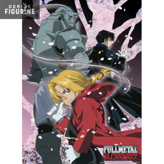 Ce poster nous montre Edward Elric au premier plan, puis derrière se trouve également son petit frère prénommé Alphonse et Roy Mustang surnommé l'alchimiste de flamme. Leur petite réunion a sûrement lieu pendant la période du Sakura au Japon puisqu'on voit de nombreux pétales voler.